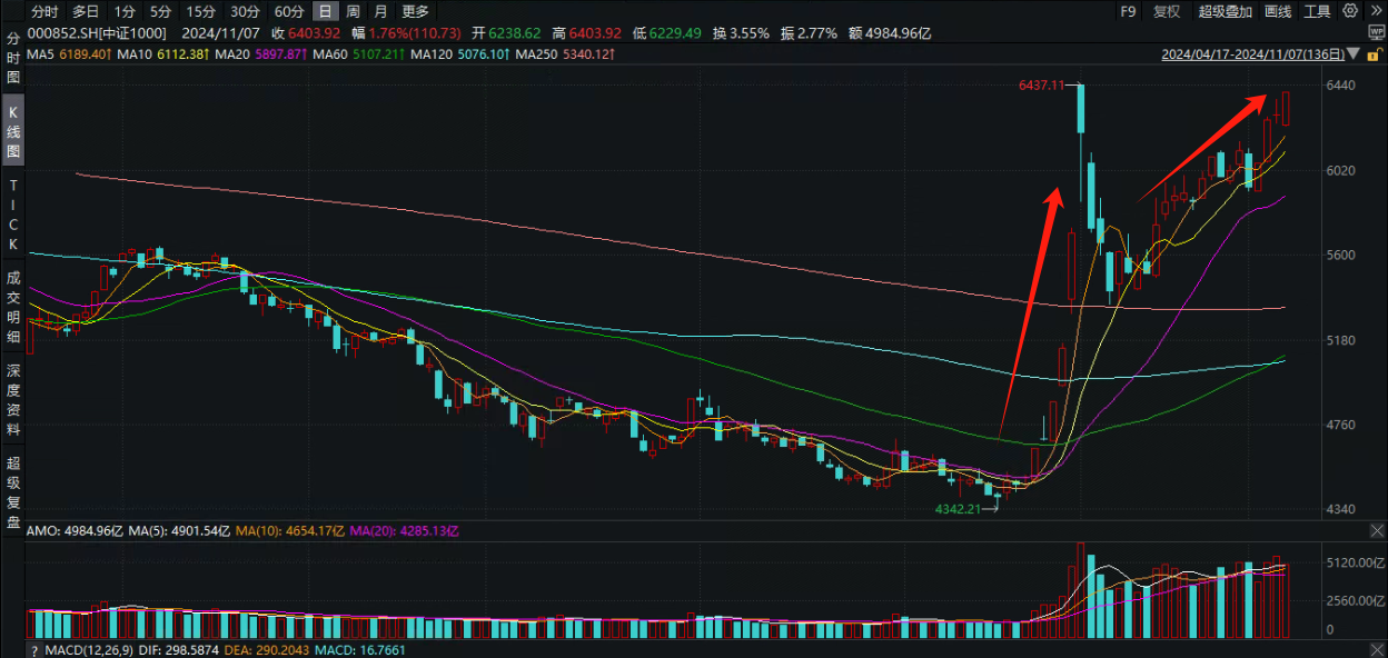 看到今年9月18日以来,中证1000指数直接从4342.21的低位涨到最高6437.11的位置,涨幅高达40.53%,妥妥的黑马!
