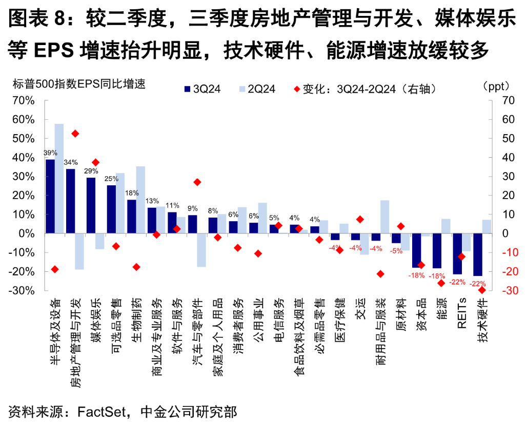 展望2025,中金公司认为,结合美国自身增长路径(2025年中经济逐步企稳修复)以及海外收入的增长预期(30-40%的海外收入),美股2025年盈利增速或达到10%,略高于今年的9%。AI产业趋势依然维持乐观情绪与高利润率。