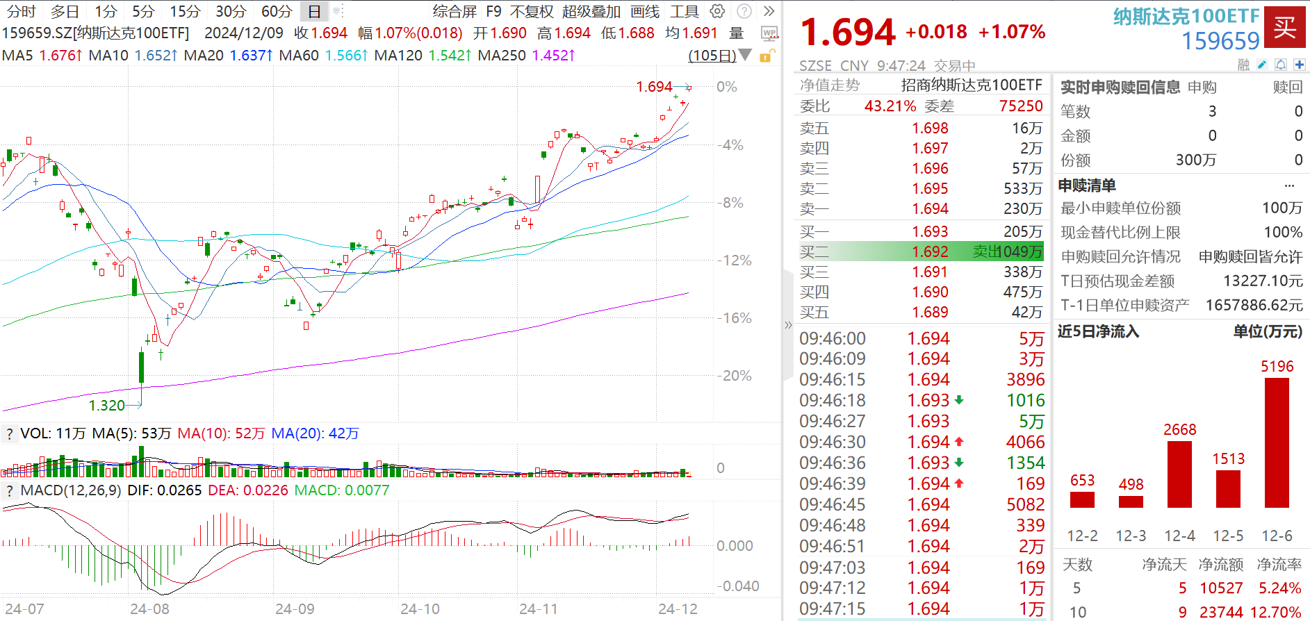 纳斯达克100ETF(159659)上市于2023年4月25日,截至2024年12月9日,盘中最新价格1.694元,继续刷新上市来高位。近期市场资金持续借道该ETF布局,近5个交易日获资金连续净流入合计超1亿元。