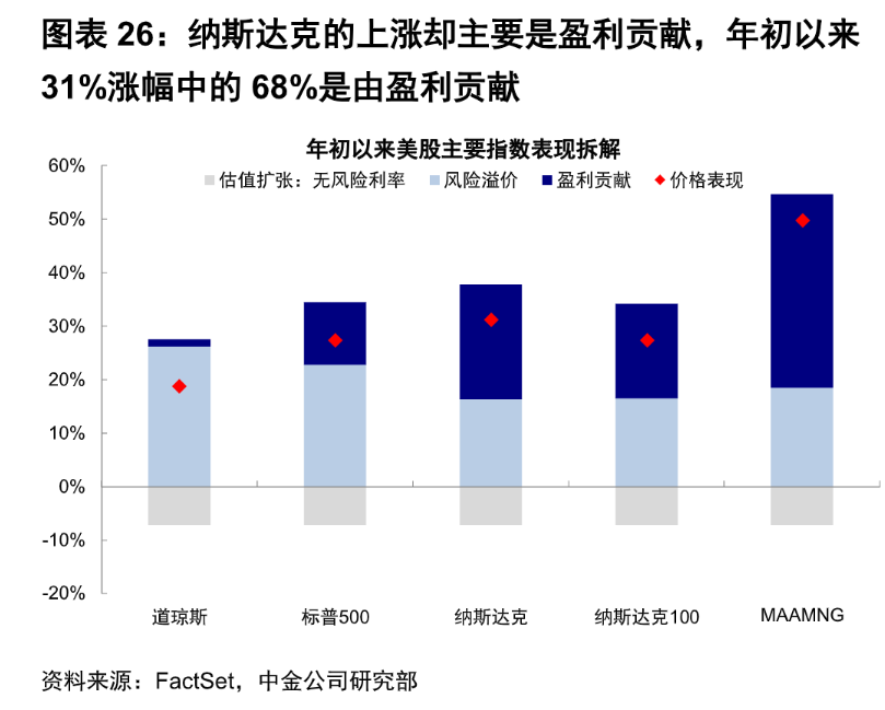 中金公司最新观点指出:盈利是纳指上涨的最核心动能,年初以来的涨幅中近7成由盈利贡献,高于道琼斯和标普500。