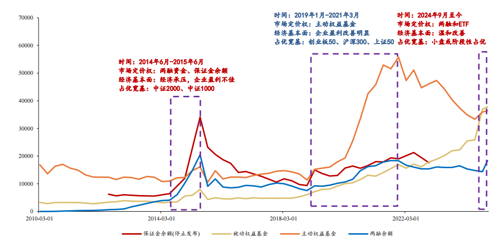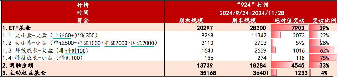 对这一问题,多个金融机构展开了研究,发现ETF基金和两融余额为主要增量资金,推动A股“权重搭台,小盘股风格唱戏”的行情形成。其中浙商证券测算了2024.09.04-2024.11.28的资金面数据,发现ETF基金和两融资金分别增加7903亿元(+39%)、4545亿元(+33%),远高于主动权益基金增加的绝对值(1233亿元)(+4%)。