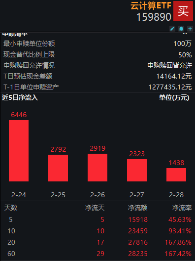 从资金面上看,云计算也正成为当下资金主要布局方向之一。根据深交所数据,云计算ETF(159890)上周累计获1.59亿元资金净申购买入,近10日该ETF净流率达93.41%。
