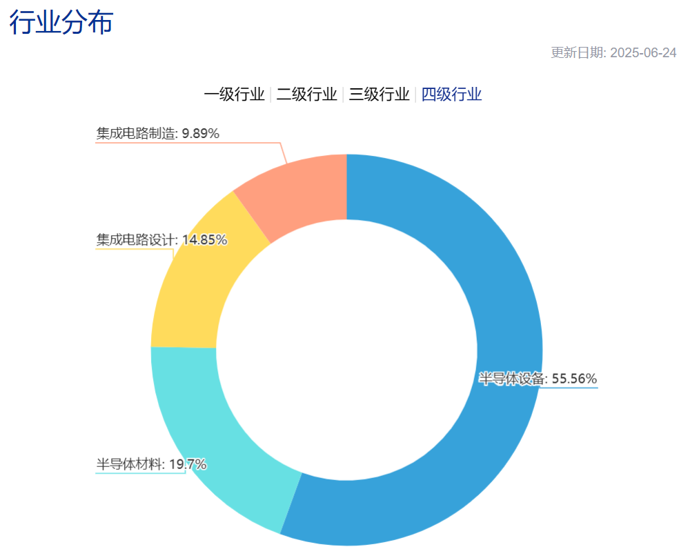 这个指数聚焦的就是上面提到的半导体产业链最关键的卖铲子环节:设备和材料。两个细分在中证半导中权重分别高达56%和20%,合计占比约76%,是同类芯片指数中含量比较高的。