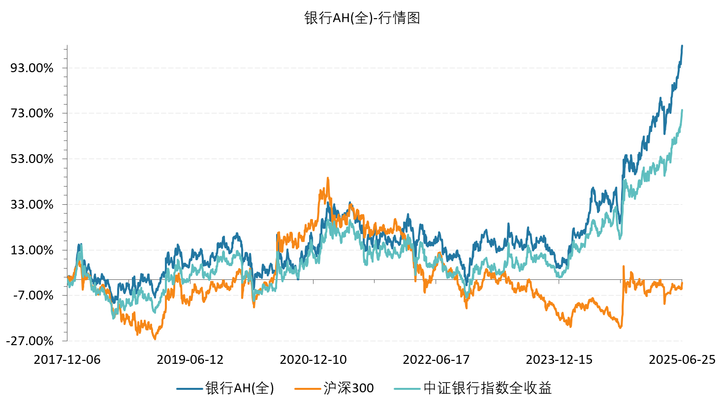 2025年以来,银行AH全收益指数累计上涨25.18%,跑赢中证银行全收益指数近7个百分点。自2017年12月6日银行AH发布至6月25日,银行AH全收益指数累计收益99.16%,跑赢中证银行全收益指数超26个百分点。