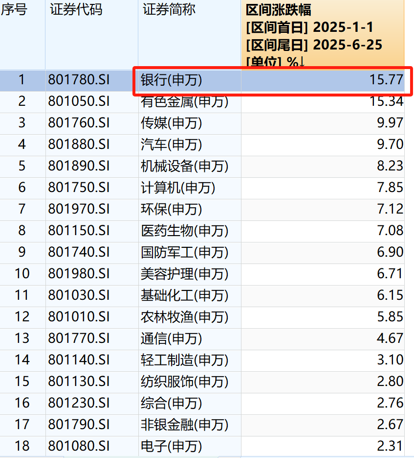 6月25日,工商银行、建设银行、交通银行等十余家银行股价再创历史新高。这并不是昙花一现——年初至今,申万银行指数已上涨14.11%,在31个一级行业中高居榜首,市值较年初增长2.05万亿元,几乎相当于“再造两个宁德时代”。