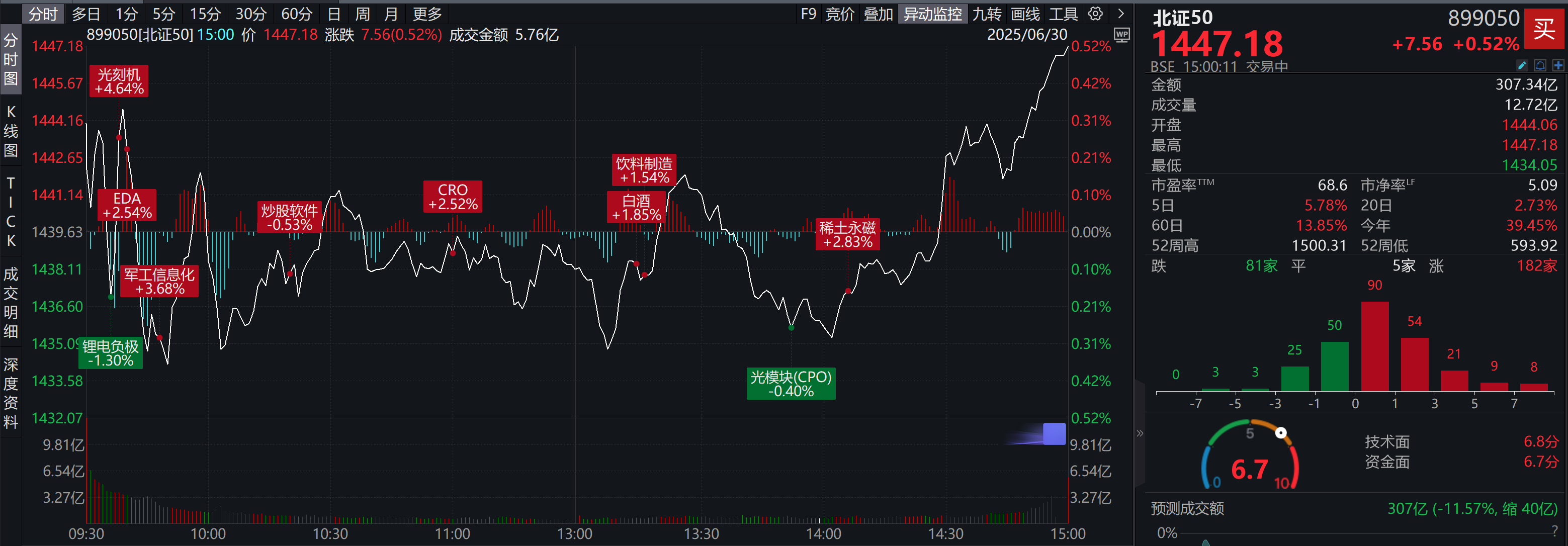 同壁财经6月30日讯,北证50今日收涨0.52%,成交额307亿元较上一交易日缩量40亿元。北交所个股182家收涨。