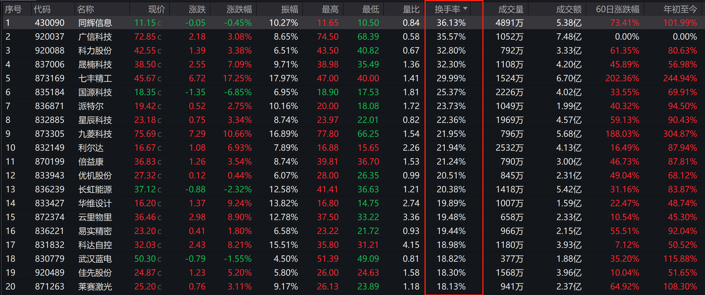 换手率前五的个股是:同辉信息(430090)换手率36.13%、广信科技(920037)换手率35.57%、科力股份(920088)换手率32.80%、晟楠科技(837006)换手率32.30%、七丰精工(873169)换手率29.99%。