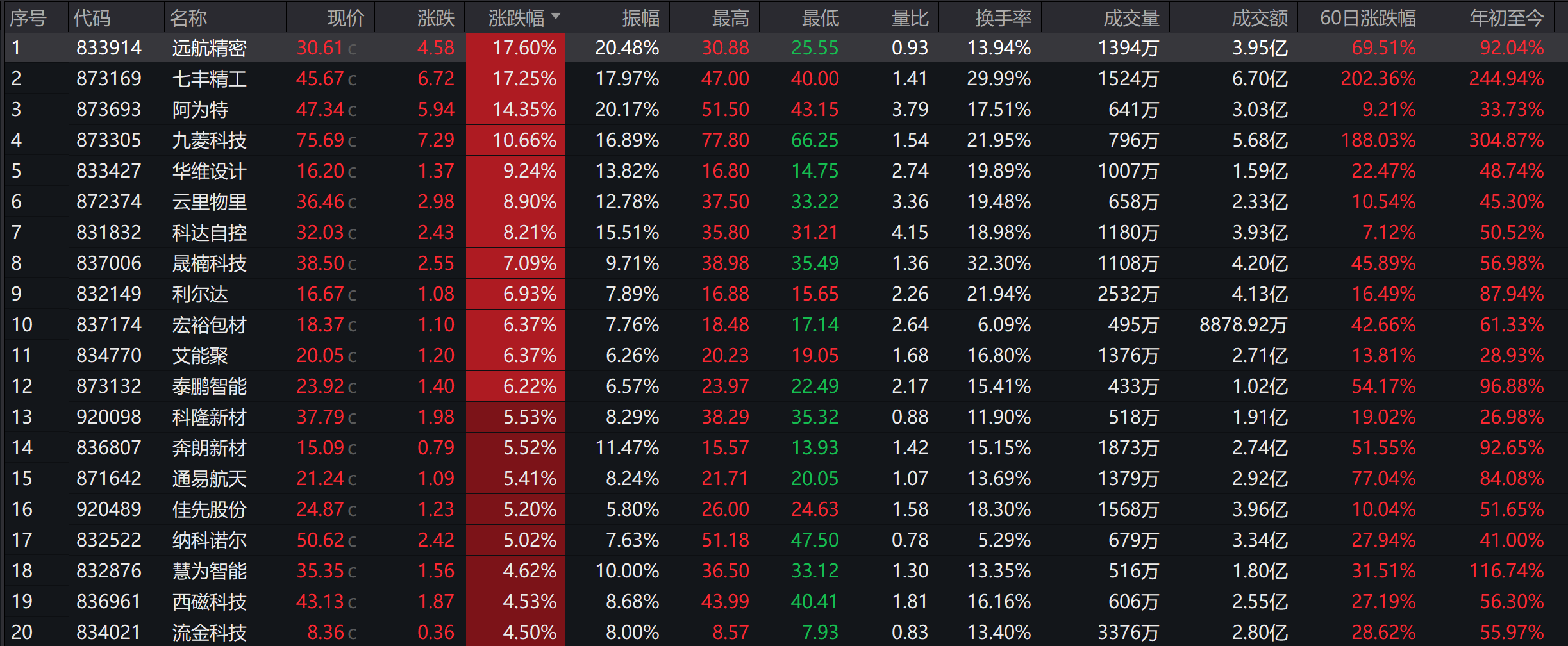 涨幅前五的个股是:远航精密(833914)上涨17.60%、七丰精工(873169)上涨17.25%、阿为特(873693)上涨14.35%、九菱科技(873305)上涨10.66%、华维设计(833427)上涨9.24%。