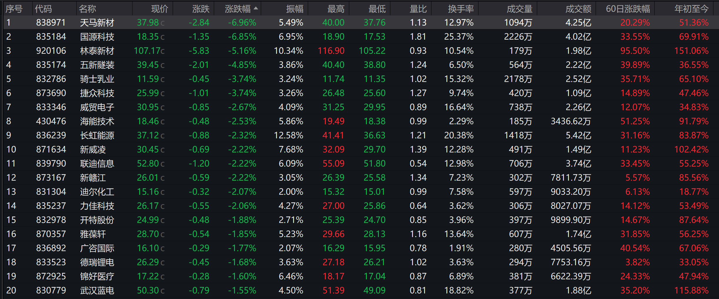 跌幅前五的个股是:天马新材(838971)下跌6.96%、国源科技(835184)下跌6.85%、林泰新材(920106)下跌5.16%、五新隧装(835174)下跌4.85%、骑士乳业(832786)下跌3.74%。