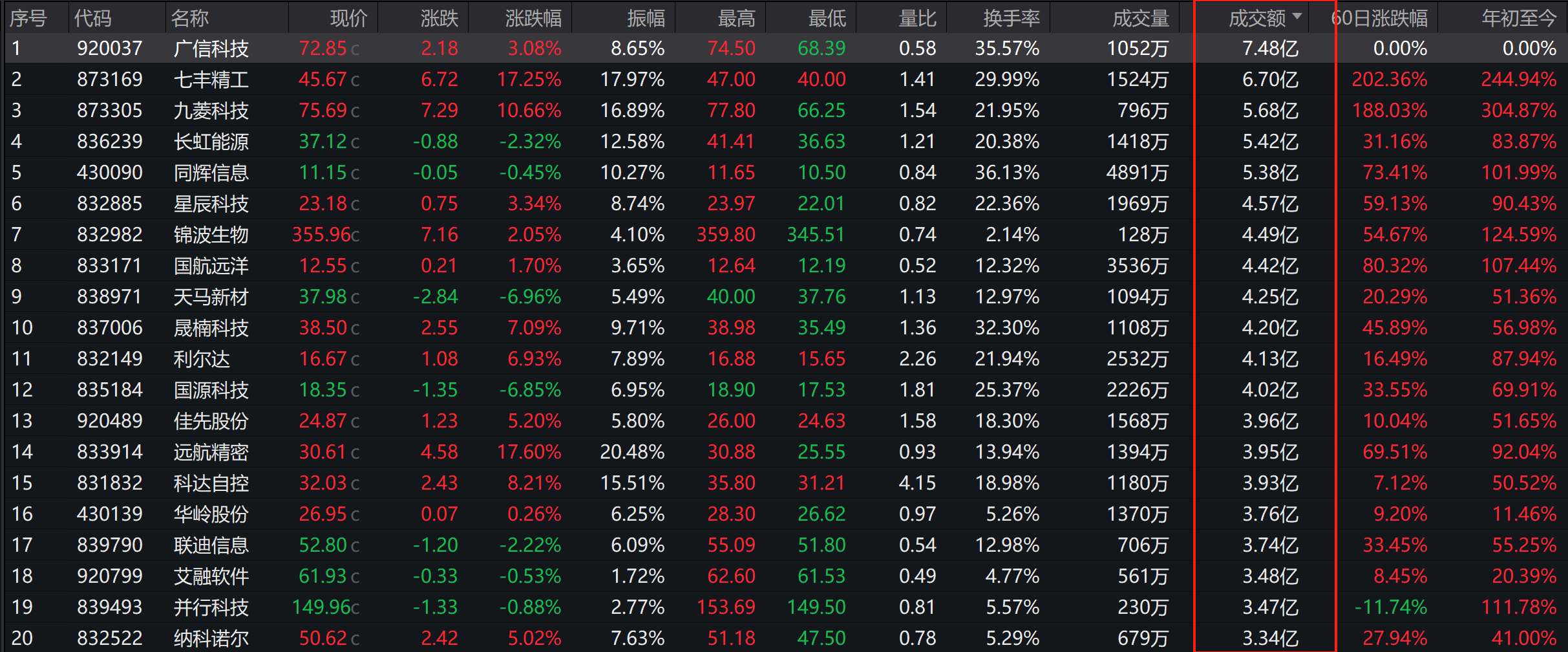 成交额前五的个股是:广信科技(920037)成交额7.48亿元、七丰精工(873169)成交额6.70亿元、九菱科技(873305)成交额5.68亿元、长虹能源(836239)成交额5.42亿元、同辉信息(430090)成交额5.38亿元。
