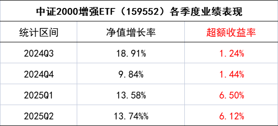 数据显示,中证2000增强ETF(159552)自2024年6月29日成立以来,每个季度均有超额,今年前两个季度超额均超过6%。