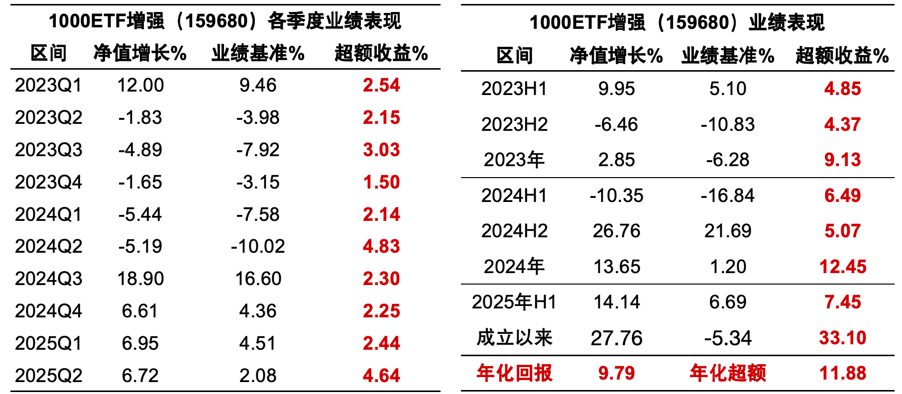 具体看,1000ETF增强(159680)各个季度、半年度、自然年度相对业绩比较基准均有超额收益,截至6月30日,累计超额收益33.10%,年化超额收益11.88%。