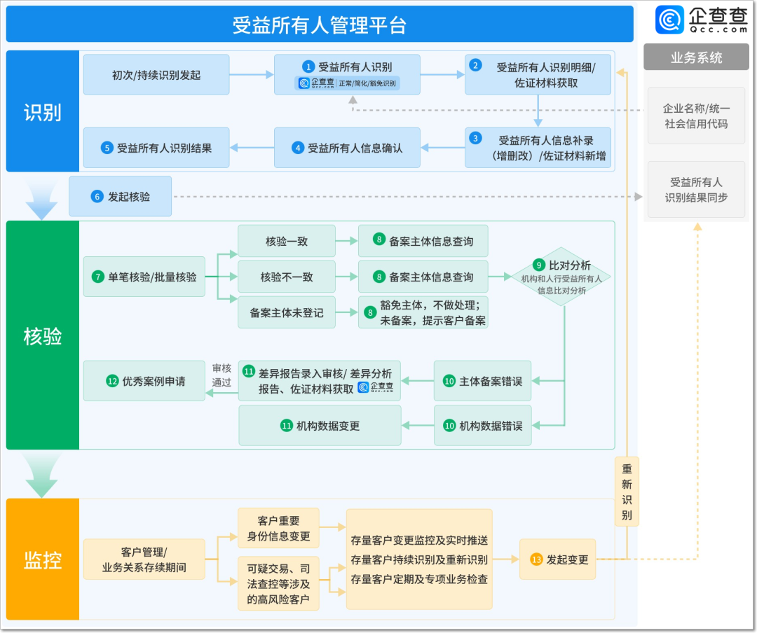 受益所有人持续识别场景下,通过触发受益所有人变更推送机制,构建“系统监控→结果推送→持续识别→备案核验→差异分析→佐证材料”的工作链路,实现受益所有人的完整闭环管理。