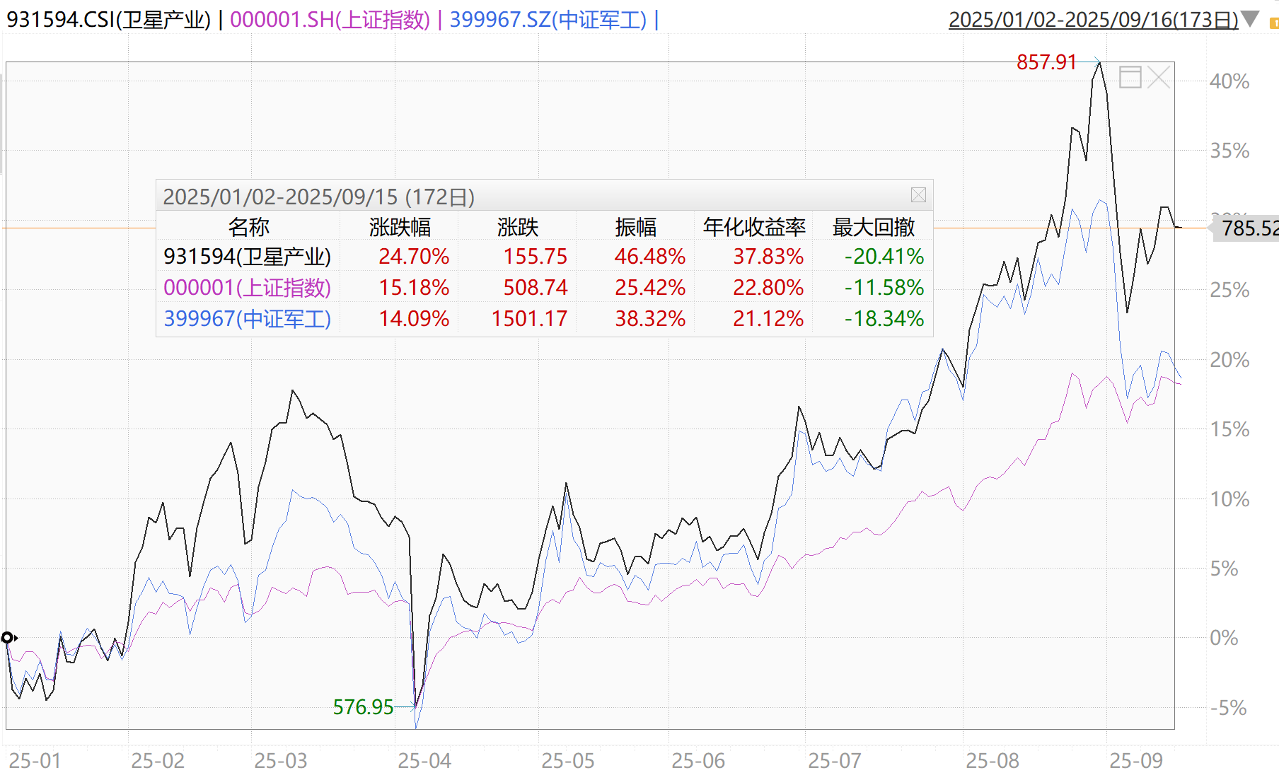 而且2025年开年至9月15日,卫星产业指数累计涨幅24%,显著跑赢大盘和中证军工指数9个百分点左右,弹性很好的。