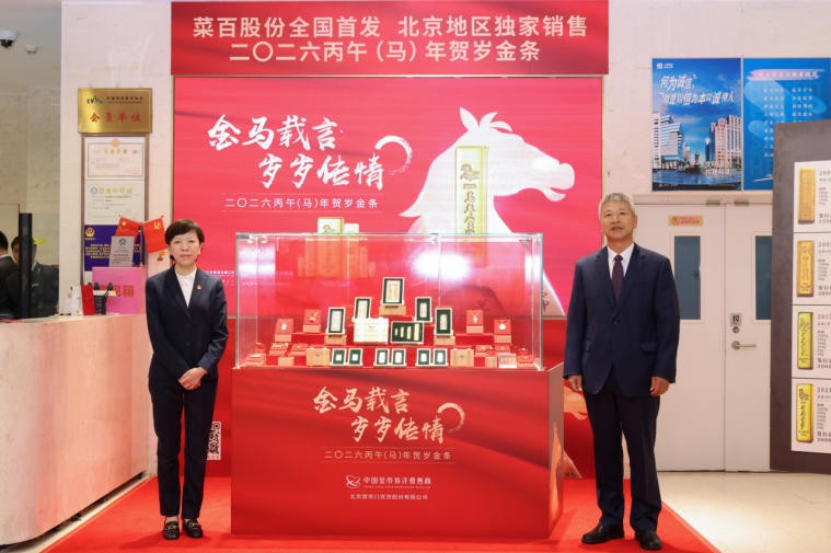 11月25日,中国金币集团有限公司和北京菜市口百货股份有限公司(605599.SH)全国首发2026丙午(马)年贺岁金条,这是该系列产品连续发行的第二轮第十二组贺岁金条,也是菜百股份连续第24年北京地区独家销售,中国金币集团有限公司副总经理李泽云,品牌与文化传播部副总经理邹智勇,市场营销部高级经理王志,上海金币投资有限公司副总经理贾俊强,董事王琦,菜百股份党委书记、董事长谢华萍,党委副书记、总经理宁才刚以及中国金币生肖贺岁金条图案设计师董宏亮出席首发仪式。