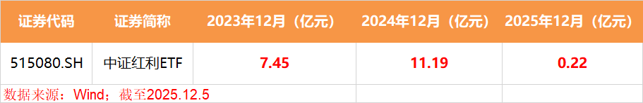 以中证红利ETF(515080)为例,wind数据显示,2023年、2024年12月,该ETF月度净流入额分别为7.45亿元、11.19亿元,显示出较强的资金流入效应。今年12月,中证红利ETF(515080)区间累计净流入额为0.22亿元;拉长周期看,近10日该ETF区间累计净流入额达2.7亿元。