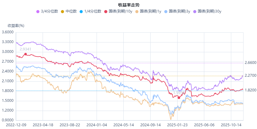 截至12月8日当日收盘,利率债收益率呈现短端平稳、长端小幅上行的格局。按照中债估值曲线来看,1年期国债收益率在1.4014%附近,变化较小,3年期国债收益率反而下行0.5bp至1.4014%,反映出市场对短期流动性宽松的预期稳固;而10年期国债收益率上行0.2bp至1.8499%,30年期国债收益率上行至2.2577%,超长端利率近期波动加剧,主要源于对财政发力、经济“开门红”、股市年初日历效应的提前博弈。从机构行为看,当前银行、险资等配置盘更倾向于增持3-5年期中短端利率债,而交易盘对超长债的持仓较为谨慎,导致利差转向陡峭化。