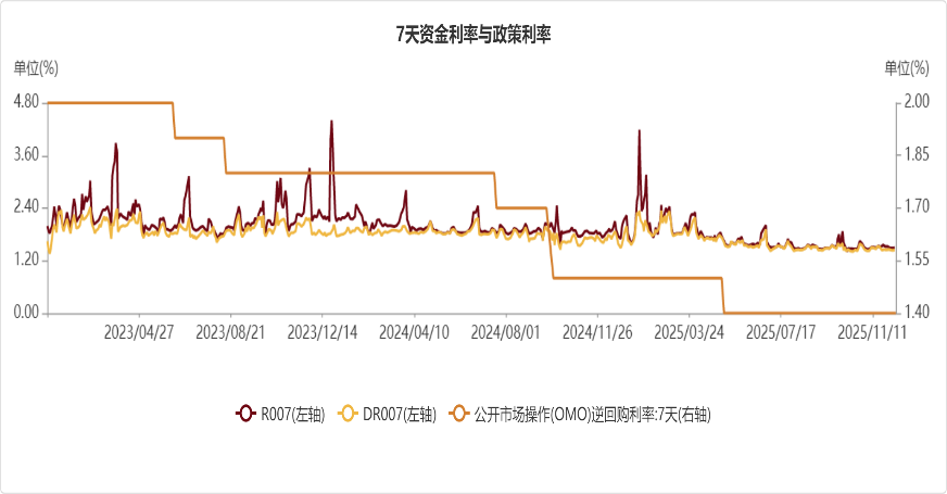 货币政策的“适度宽松”基调是债市最核心的支撑。一方面,国内经济“弱复苏”背景下,企业融资需求仍待提振,央行需维持流动性充裕以降低融资成本,预计2026年DR007将持续围绕政策利率波动,短端利率仍有10bp的下行空间;另一方面,美联储12月议息会议大概率降息25bp,外部货币政策环境边际宽松,在汇率相对稳定前提下为央行降准降息打开空间。综合来看,2026年债市利率中枢有望较2025年进一步下移,为carry策略提供了基础。
