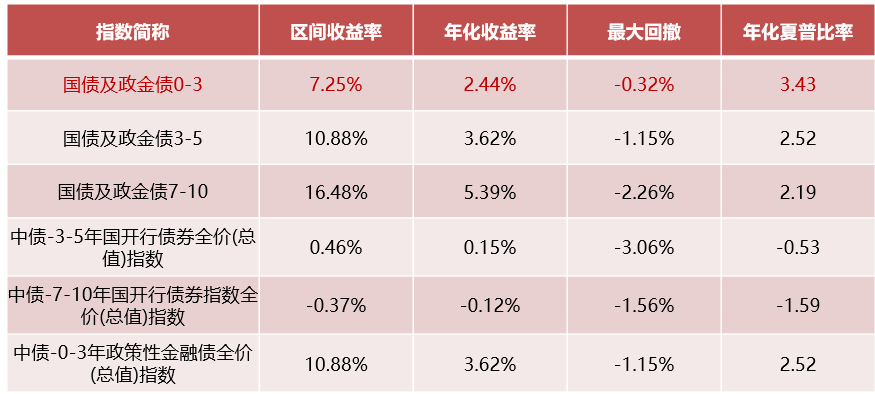 从风险收益表现来看,截至11月30日,国债及政金债0-3指数近3年年化回报2.44%,最大回撤-0.32%,年化夏普比率3.43,相对其他主要利率债风险收益比更优。
