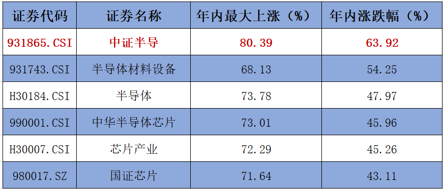 截至12月30日,中证半导2025年年内涨幅63.92%、最大上涨超80%,在中证全指半导体、中华半导体芯片、国证芯片等主流半导体指数中均位列第一。
