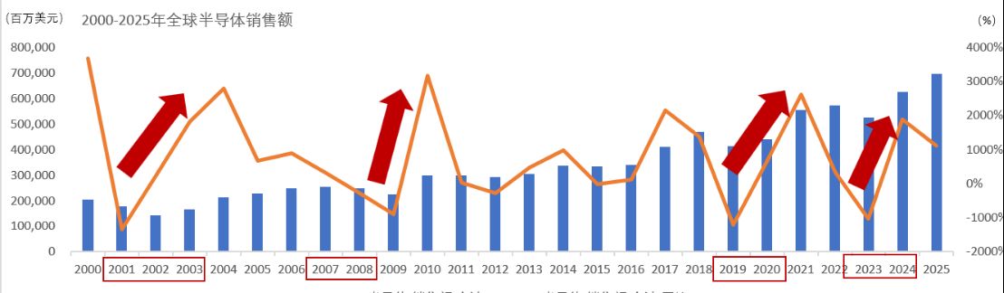 作为全球最主要的储备货币发行方,美联储通过利率政策调节美元流动性和全球经济融资成本。当美联储维持高利率时,企业资本开支趋于谨慎,云服务商、数据中心等半导体下游大客户往往会推迟服务器和AI硬件的采购计划;而一旦货币政策转向宽松(如启动降息),融资成本下降、风险偏好回升,将直接刺激科技企业的扩产与设备投资。历史数据显示,在过去四轮降息周期中(2001年、2007年、2019年、2023年),全球半导体月度销售额均出现明显回升。