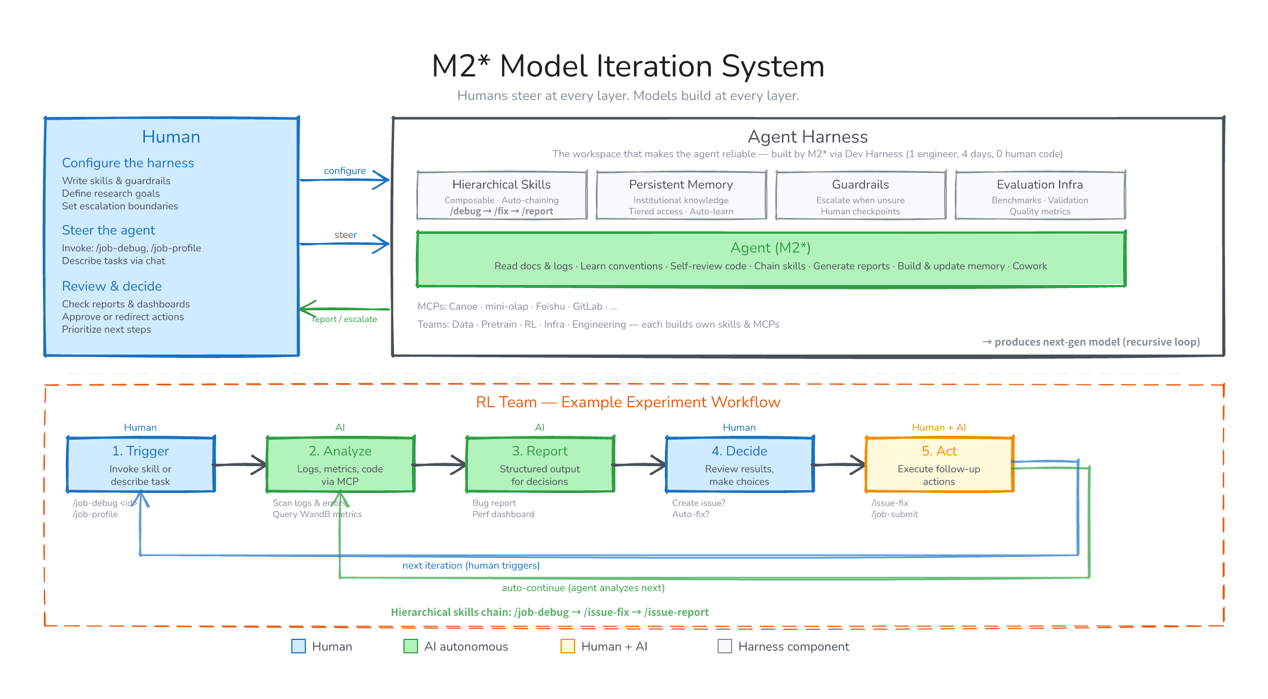 从技术路径来看,M2.7的关键在于构建了一套以Agent为核心的自我进化系统。在该体系中,模型不仅承担生成与推理任务,还通过构建复杂的Agent Harness(智能体执行框架),参与数据处理、实验设计、训练调优与评测反馈等完整研发流程。换言之,模型开始成为模型研发流程的一部分,而非单一工具。
