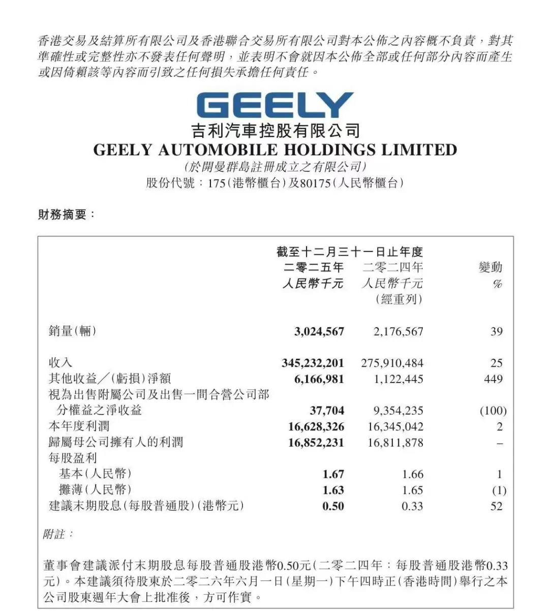 与此同时,吉利汽车控股有限公司宣布建议每股派息提升51.5%至0.5港元,以真金白银回馈股东,共享发展成果。吉利控股集团CEO安聪慧表示,吉利汽车的高质量发展,不仅体现在销量上,也是品牌价值上的提升,更为26、27年的发展打下良好基础。