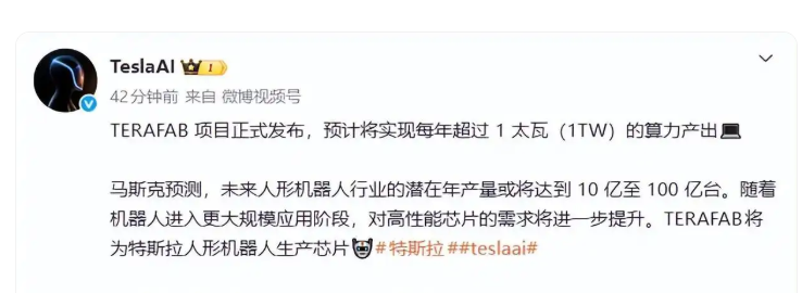 同一时间,据悉,特斯拉(TSLA.US)TERAFAB项目正式发布,预计将实现每年超过1太瓦(1TW)的算力产出。