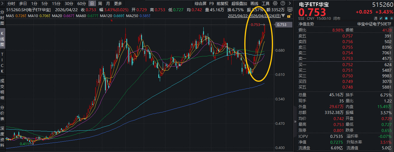 接着奏乐接着舞!PCB龙头东山精密、鹏鼎控股涨停,同创历史新高,荟聚电子板块核心龙头的电子ETF华宝(515260)场内价格猛拉3.43%,12天11阳强势突破,于今日刷新上市以来的高点!