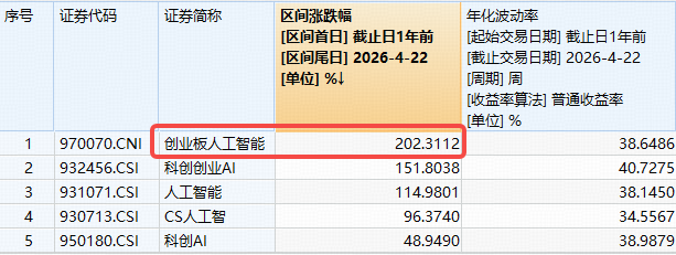 时间拉长看,近期光模块CPO、算力租赁、AI应用轮番上阵,创业板人工智能继续领跑其他同类AI主题指数!截至4月22日,高“光”创业板人工智能ETF华宝(159363)标的指数近1年累计涨幅高达202%,大幅跑赢全市场同类AI主题指数,持续超额表现!