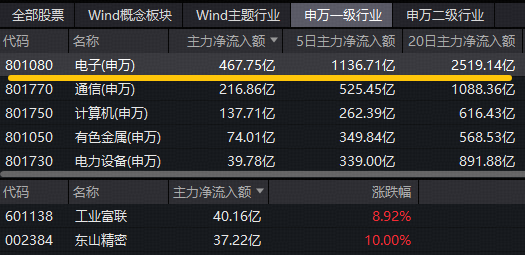资金面上,电子板块全天获主力资金净流入467.75亿元,拉长时间来看,近5日、近20日分别吸金1136.71亿元和2519.14亿元,板块吸金额持续高居31个申万一级行业首位!工业富联、东山精密分别获主力资金净流入40.16亿元和37.22亿元,霸居A股吸金榜第一位和第三位。