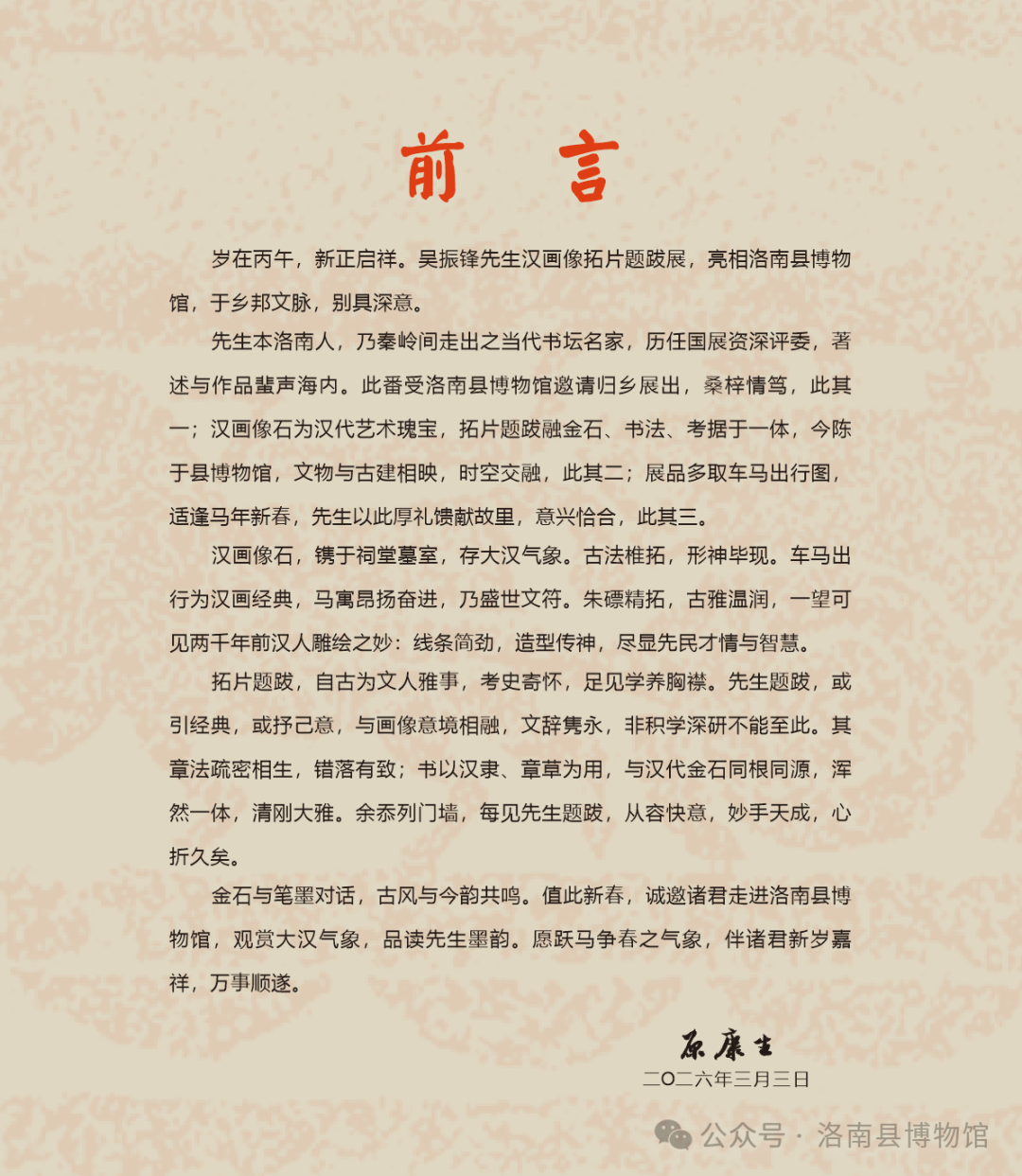 岁在丙午,新正启祥。为传承中华优秀传统文化,丰富群众精神文化生活,“跃马争春——吴振锋汉画像石拓片题跋展”在汉字故里——洛南县博物馆隆重开展。这场跨越两千年的金石雅集,由乡贤名家吴振锋先生倾情呈现,共展出精品力作20幅,以古拓为媒、以笔墨为韵,为洛南献上一场文气充盈的艺术盛宴。