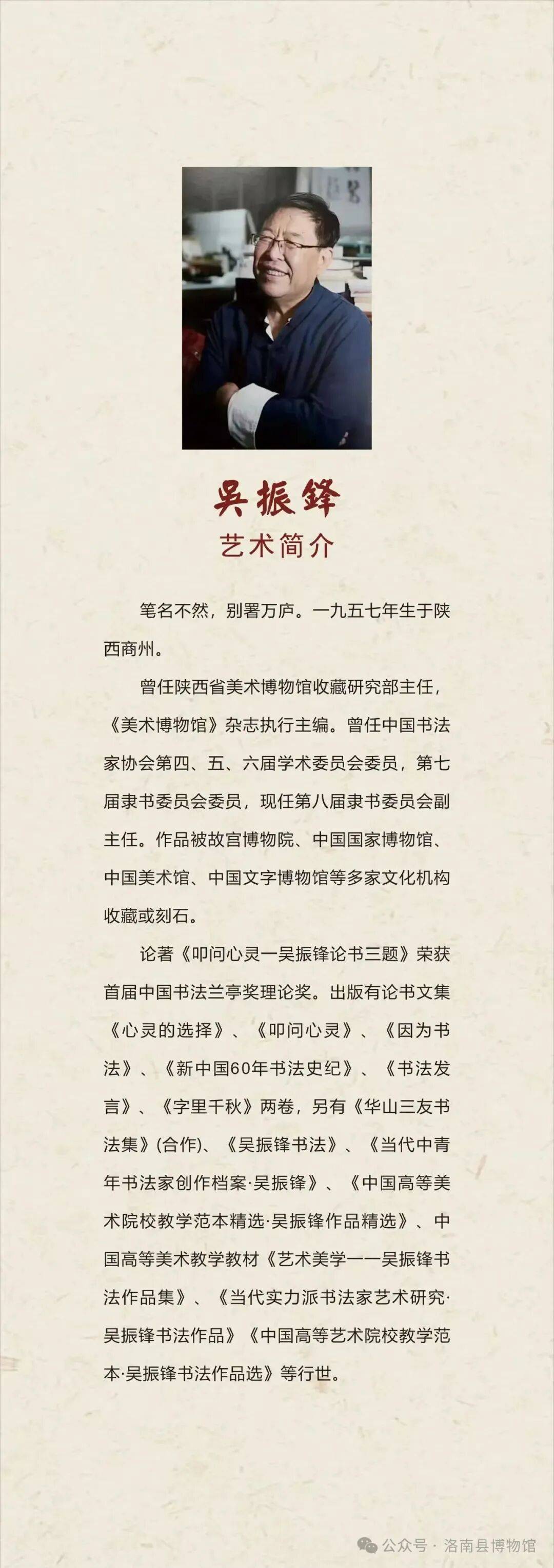 吴振锋先生是从秦岭深处走出的当代书坛名家,现任中国书协隶书委员会副主任,长期担任全国书法大展资深评委,著述与作品蜚声海内。此次应洛南县博物馆邀请归乡办展,既是桑梓情深的真切表达,更是文化反哺故里的重要实践,意义深远。