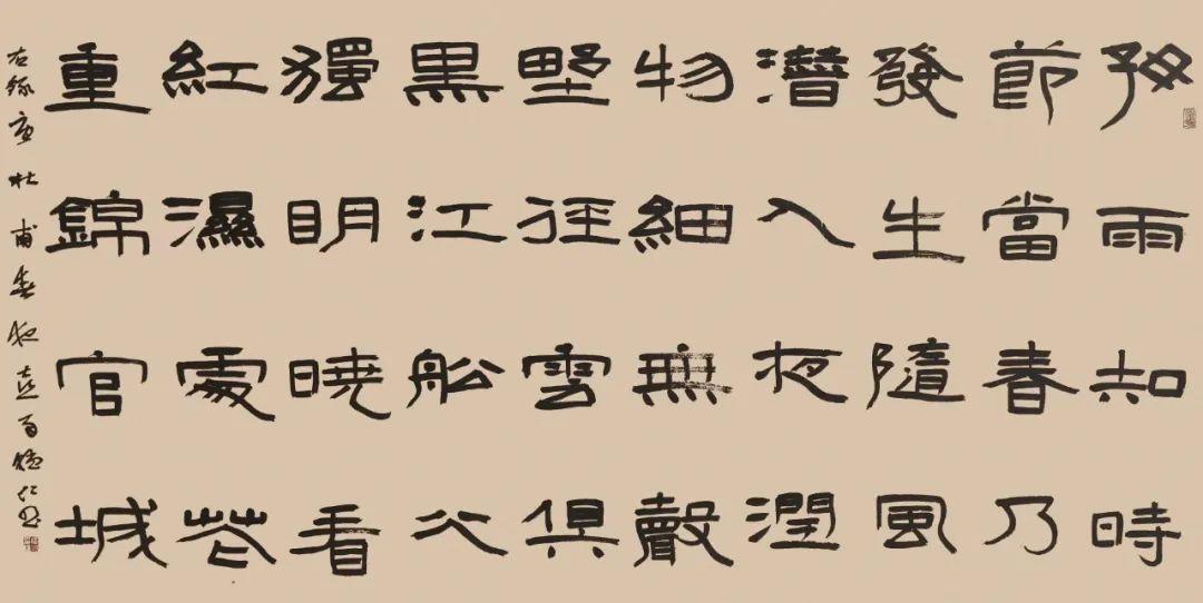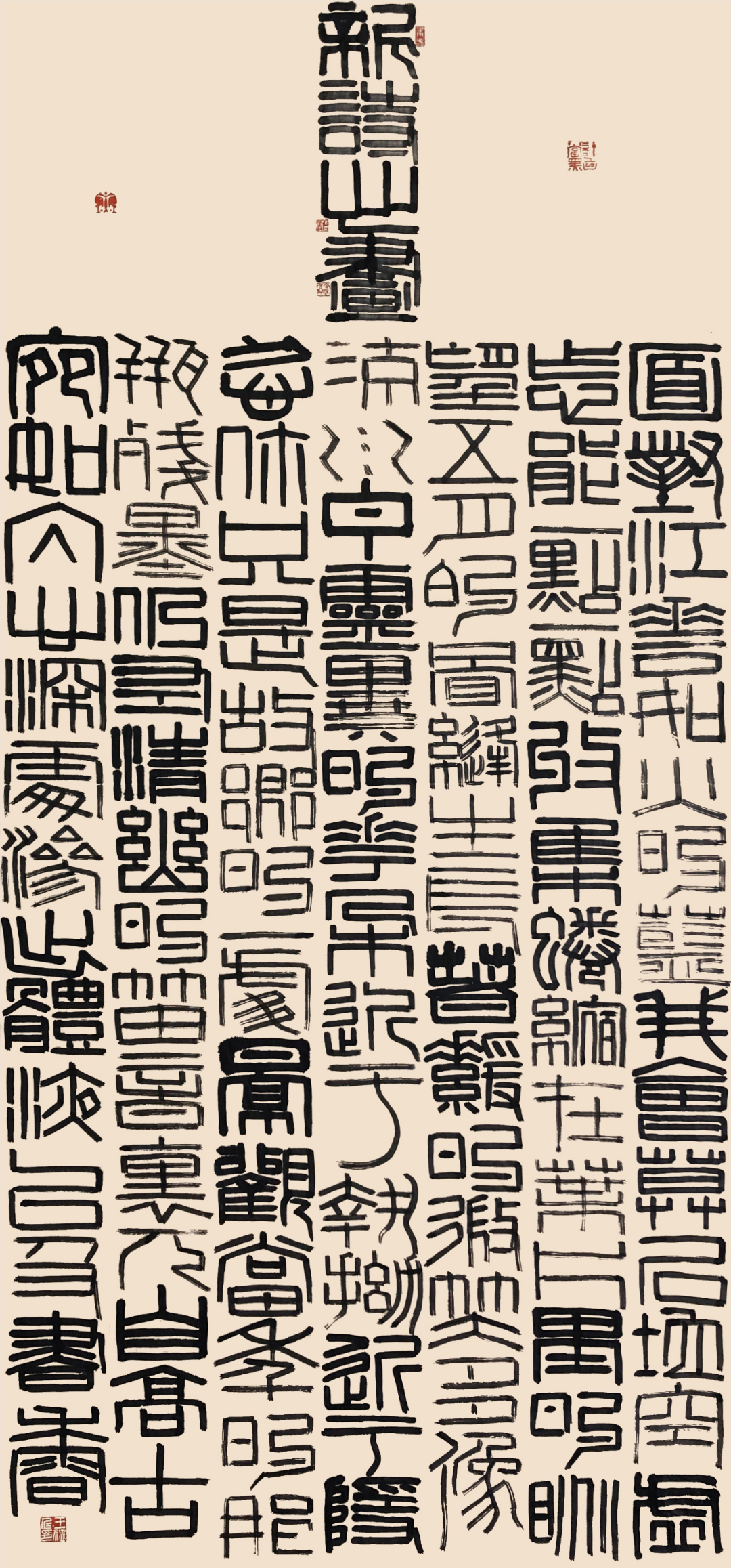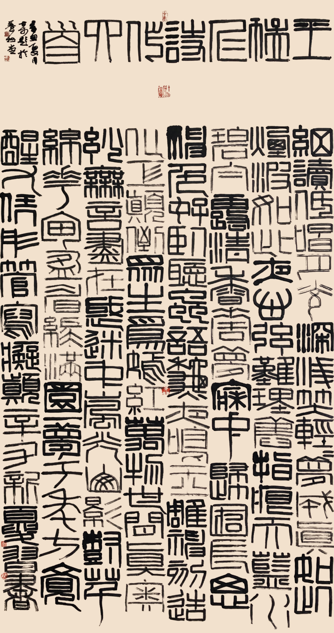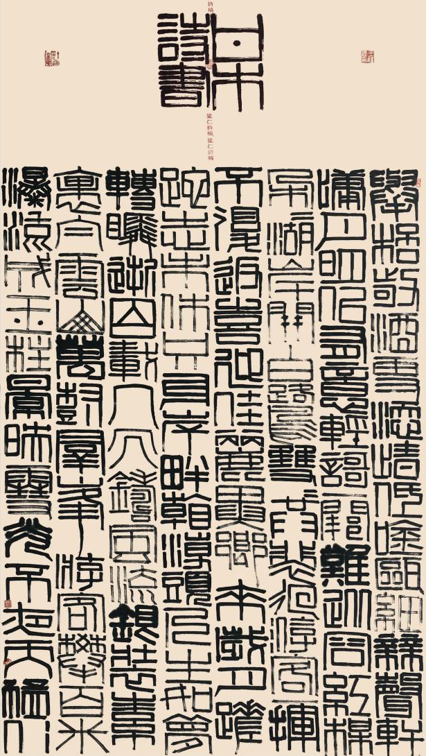 王猛仁:如果着眼于文字的发展源流,从篆书启蒙,也有一定的合理性。但是,篆书的文字结构复杂,识别不易,故从篆起步者寥寥无几。近人习篆者,多从石鼓文入手,其结体接近秦篆,而且保留金文的意态较多,古朴浑成,而没有小篆的框架束缚。邓石如、吴昌硕的篆书对后人影响较大,开宗立派,成就显赫,实可谓集秦汉篆之大成。学篆绝不能止步于邓、吴,而应放宽视野,向汉隶、简帛、先秦书、金、甲拓展,提倡各种书体之渗透,则远路宽坦,富有春秋。我的篆隶作品就借鉴了古人的长处,即借鉴了秦诏版、汉篆、汉碑额、秦瓦当等优点,涵泳贯通,让平淡无奇的书写和书法的视觉美感,有了新的突破。白贲无咎,书风成否,自待后人定论。