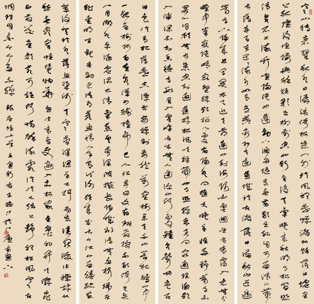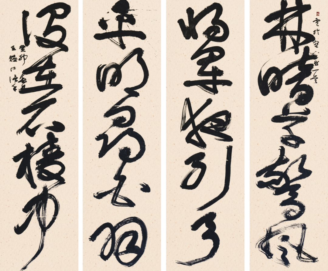 王猛仁:在书法源远流长的发展史上,各种书体的产生、发展,总是与其赖以生存的土地和赖以滋生的母体犬牙交错,很难界定其产生的确切年代。众所周知,今草起源于章草,而章草又是由隶书发展而来。汉末的蔡邕说:“昔秦之时,诸侯争长,简檄相传,望烽走驿,以篆隶之难,不能救速,遂作赴急之书盖今草书是也。”如今,一大批秦汉时代的简牍帛书出土,笔迹清晰,年代明确,为我们研究草书提供了有利依据。我认为草书是书法诸体中最为精微的一种书体,所以古人有“匆匆不暇草书”的命题。通晓草书,不写错字,是学习书法的先决条件,也是习草的重要阶段。在此期间,我学习过章草,临写过《千字文》,学过《怀素自叙帖》,这些草书法帖,结体平正,妙趣天成,容易入手,收获甚多。回头再临其他,标尺古人,不薄今人,比如于右任、王铎的行书,便感同身受,有滋有味,不可自拔也。其实,在学习中,任何碑帖都有其艺术法则,点画皆有旨归,如果认识于斯,就会不再认为风格独立,野性难驯了,只觉得十分亲切,十分可爱。一旦思想观念有了更新,得心便易措置。这就是我写行草的感悟,也是借此步入草书殿堂的唯一路径。