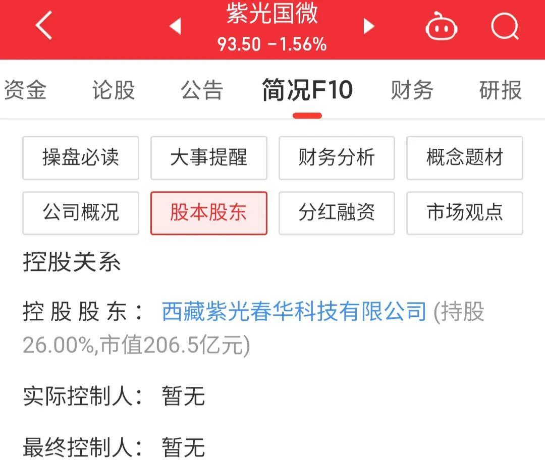 紫光国微的控股股东是西藏紫光春华科技有限公司,西藏紫光春华科技有限公司被北京紫光资本管理有限公司100%控股,北京紫光资本管理有限公司的实际控制人是教育部。