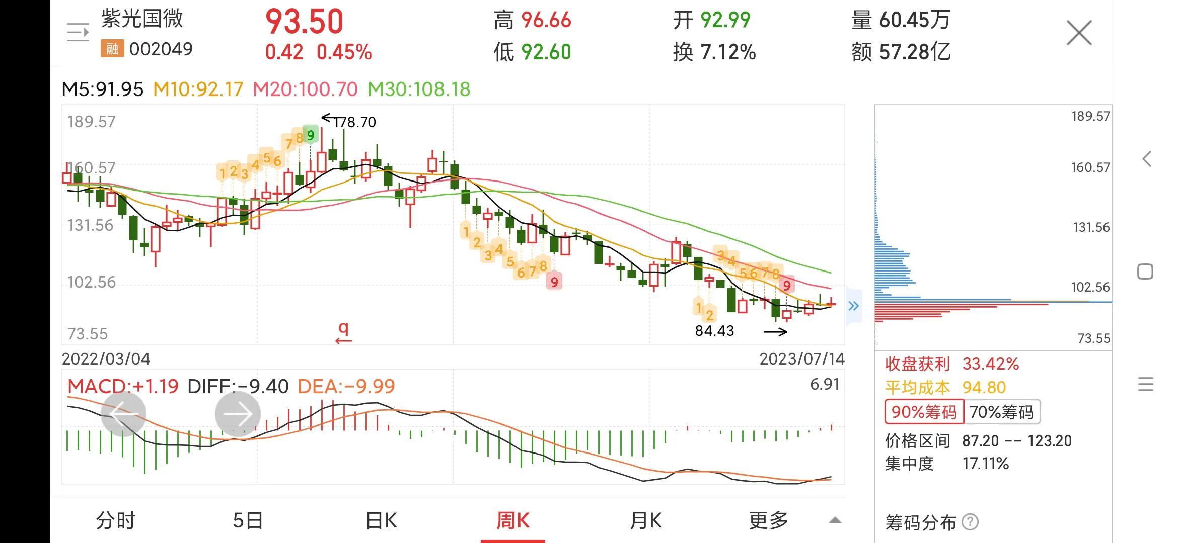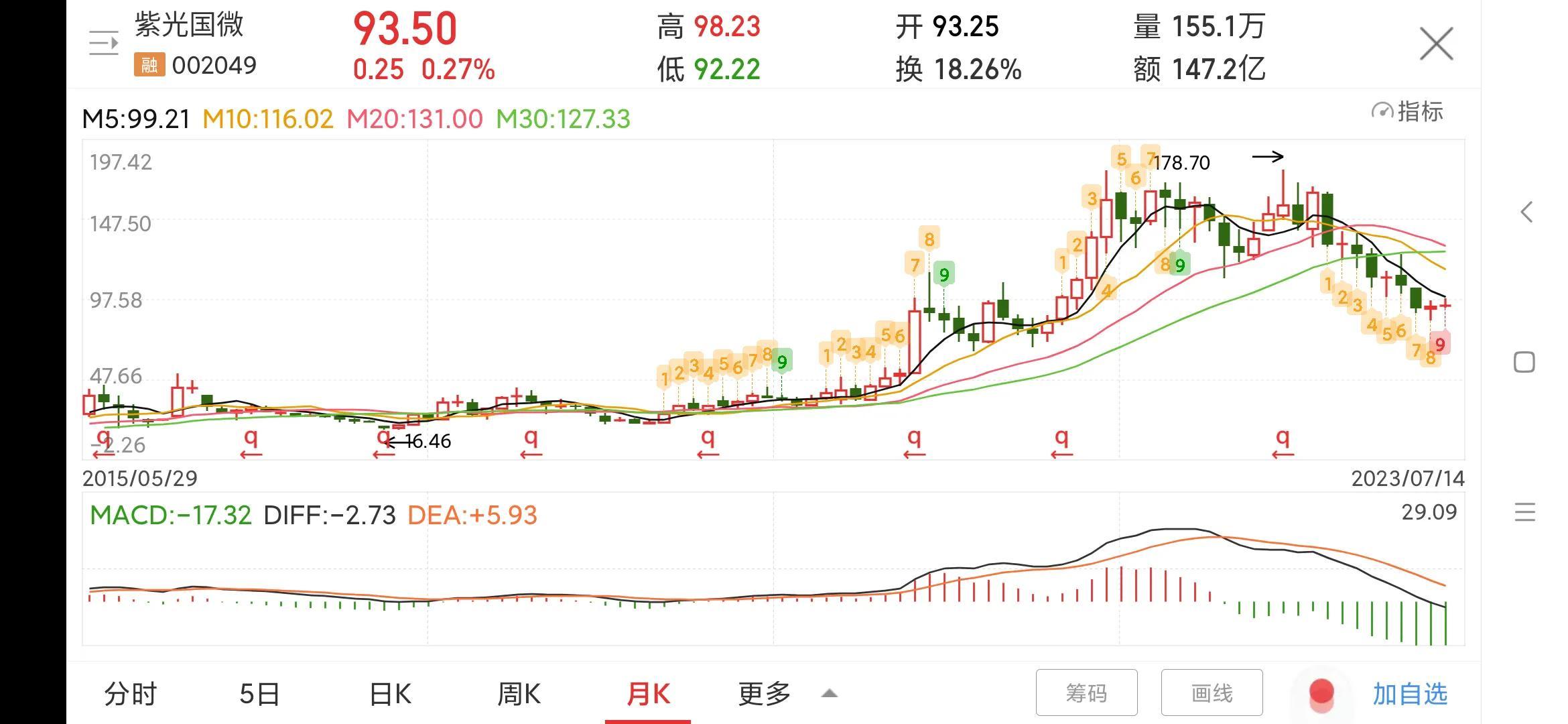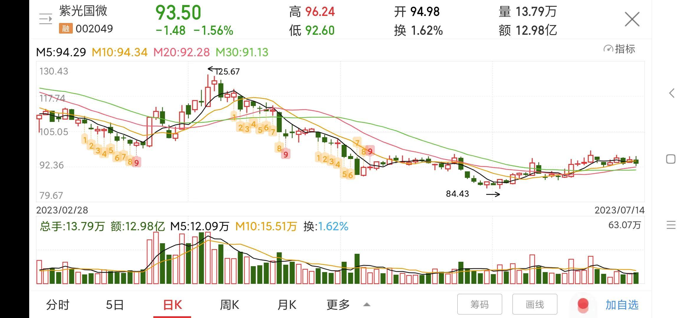 紫光国微的主要营收来自于集成电路和安全芯片,技术背靠清华大学,业务背靠央企,较高的毛利率,较低的市盈率,决定了公司业绩增长具有源源不断的动力。2023年全球经济增长放缓,消费电子需求减弱,二季度半导体行业基本面整体仍将持续承压,不过随着三季度设计厂商库存调整,以及芯片龙头供给端缩减,供需结果下半年有望逐步改善。目前紫光国微的股价也被砸出一个大坑,底部盘整需要多久,这个还要看市场环境和紫光国微的业绩。股价短线震荡,长线看多。