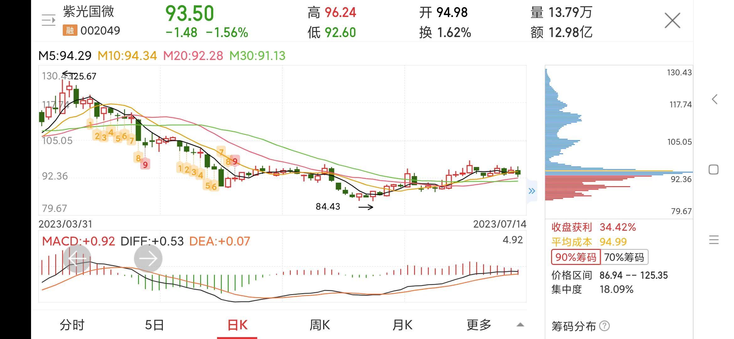 日线看,紫光国微股价已经跌到底部,并在底部横盘震荡,成交没有放量,股价还没有突破96元的压力平台,还在磨底。筹码分布显示,上方高位很多筹码被套,下方底部平台涌入大量抄底资金,资金以观望为主。