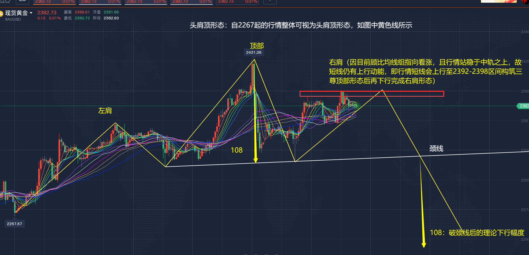 3、头肩顶形态:自2267起的行情整体可视为头肩顶形态,如图所示。依据现有行情可知,目前行情已完成左肩和顶部形态,现正构筑右肩,根据顾比均线组和盘面信号可知,短线而言而是多头趋势,故郭广盈判定行情仍会上行寻找昨日阻力区间2392-2398后构筑三尊顶部形态完成右肩再下行,即今日走势可判定为先涨后跌!