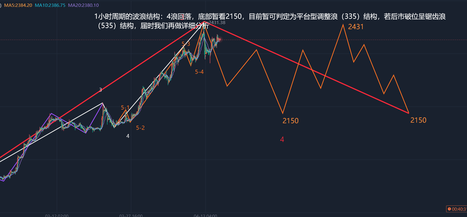 4、黄金波浪结构:因行情于阶段性高点2431附近录得阴线构筑看跌吞没形态,于阶段性高点录得反转形态,故郭广盈判定此次反弹结束,即3-5-5浪已于2431结束,现行情处于4浪中期调整之中,根据波浪理论推演可知:4浪理论底部位于3-4浪底部附近,即此次中期调整的理论底部位于2150附近!因大一级别的2浪呈锯齿浪展开,根据波浪理论的交替原则可知:4浪大概率将呈横向调整展开,即可细分成平台型调整结构(335结构)展开,届时我们再另做细分。