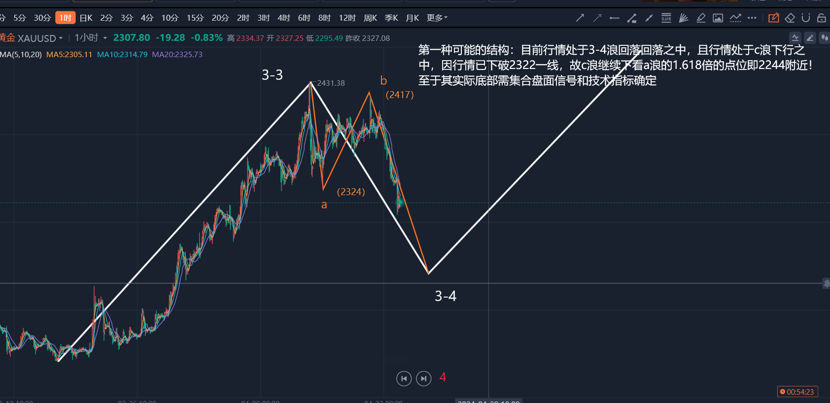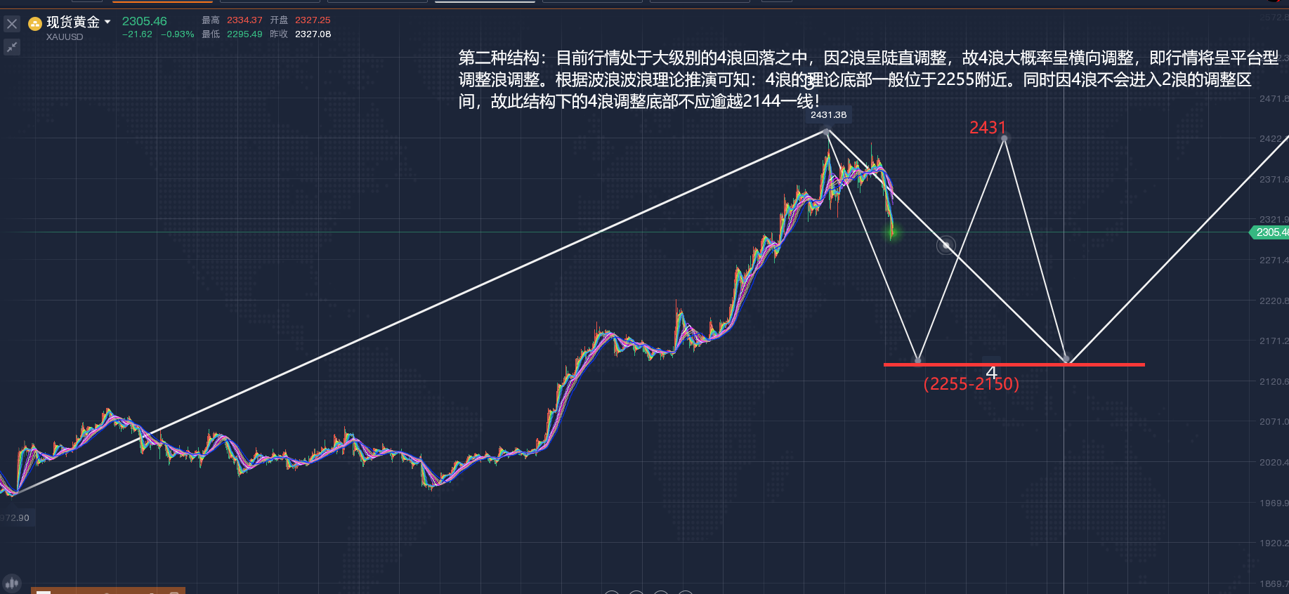 由之前的分析可知:目前行情正处于自1984起的大级别的3浪上行之中,同时根据现有行情,我们可将3浪细分成5浪结构且处于3-3浪加速上行之中,因行情于阶段性高点2431附近录得阴线构筑看跌吞没形态,于阶段性高点录得反转形态,故郭广盈判定3-3浪已于2431附近结束,现行情正处于3-4浪回落之中。因行情下破2310一线,最低企及2295一线并未见反转信号,故郭广盈判定行情已排除第三种可能的波浪结构,即后续的波浪结构仍有两种可能的走势(第三种种可能的波浪结构在这里便不再赘述,感兴趣的朋友可去参阅之前的文章),如下: