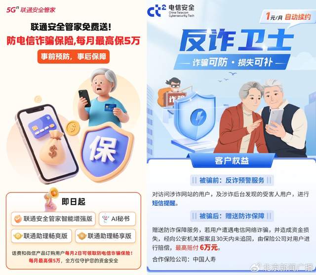 北京联通“安全管家”:用户订购智能增强版可免费获赠月保额5万元的反诈保险。业务特点包括: