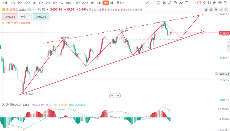 今天黄金的力度很弱,早盘仅仅只是一波冲高,晚间快速下探跌破3400关口,前面我们也说了,守住关键点3400之上,黄金继续保持看多,而现如今跌破3400之后短线已经走出小级别的顶部,市场也不再那么强势,对于我们短的操作而言,短线回调金价关注日线周期MA5支撑,以及周线级别MA5支撑去多,反抽关注3403-3408阻力卡空,反弹可以跟空,注意只能是短线!黄金虽然是跌破了3400,短线方向虽然是改变了,但是大方向依旧没有改变,依然是多头,未来我们依然有机会看向3500的高点,但是要等待底部企稳之后,现如今只能线顺势而为,市场怎么走我们就怎么做,这两天反弹先空!
