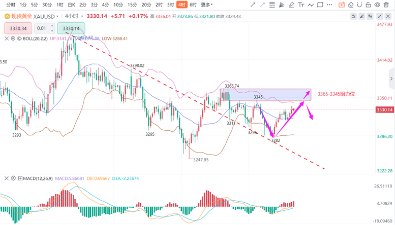从技术面来看,现在各周期都看涨明显,日线从周二见底,周三,周四都是小碎阳走高,连续的话先看日线布林中轨3345压制是否破位,破位后大阳收高这波上涨可能会到3400,所以,日线周期的上涨空间很大,不可掉以轻心。H4周期需要看今天的上涨是否能破位3345,因为破位3345就有上轨开口的可能,上轨开口后,黄金就有单边的走势,因此,今天看涨的目标在3345,3345不破就还有回落的可能,3345破位,上方就有3365,3400。李斯裕在这里明确看涨,并且看好3345破位。确定方向后,周五的交易思路也就明确了,肯定是回落做多为主,下方支撑在3320-3310,亚欧盘不追多,有回落再交易。