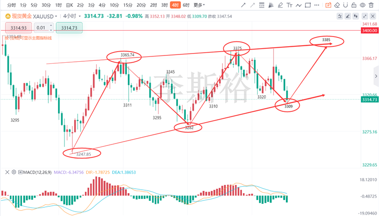 金价昨日走势触底回升,仍然未能稳健跌破60日均线支撑,并依然处于三角震荡趋势之中,对于后市来讲,将继续维持震荡调整,等待打破趋势;黄金日线图来看,指标上来看,KDJ死叉向下,说明空头力量增强,指标支持看跌,但KDJ快线没有持续放量,有可能进入短期调整,MACD快慢线继续粘合,动能柱继续收缩至零轴附近,并横向运行,说明多空力量均衡、市场缺乏明确趋势的表现,常见于趋势休整或震荡,结合K线本身的震荡走势来看,本周的大区间看3375-3310,小区间看3355-3320。