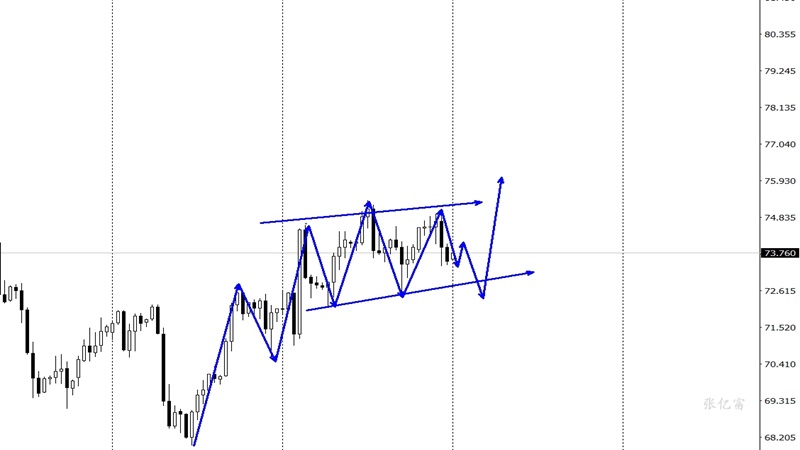 昨日黄金市场早盘开盘在2068.2美元/盎司,后行情想先回落,日线最低给到了2061.1美元/盎司,后行情展开拉升过程,日线最高触及到了2084.6美元/盎司,后行情整理,日线最终收线在了2077.4美元/盎司,行情以一根上下影线基本等长的中阳线收线,而这样的形态收尾后,黄金维持看涨。4小时图依托布林道中轨做走一波单边向上摸高的行情,结合美元的弱势,黄金就表现的更显强势,虽然节奏缓慢了点。在整理中蓄势。目前中轨的支撑在2063附近。也是昨日的低点之上。短线台阶上扬通道。综合以上分析,张亿富认为:黄金再次起涨,今日操作上考虑回撤布局多单为主,高空为辅,上方关注2090-2100美元阻力,下方关注2070-2061美元支撑。