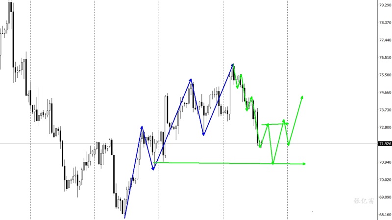 昨日美原油市场早盘开盘在73.58美元/桶,后行情先拉升给出74.21美元/桶,后行情强势回落,日线最低给到了71.52美元/桶,后行情整理,日线最终收线在了71.8美元/桶,后,日线以一根上影线很长的大阴线收线,原油延续承压中。4小时图失守中轨后依托中轨做为阻力承压震荡下行,打破了周初的整理区间下轨,今日短线先看延续性回落。综合以上分析,张亿富认为:原油空头趋势加强,今日操作上考虑反弹做空为主,低多为辅,上方关注72.4-72.9美元阻力,下方关注71.0-70.5美元支撑。周线收官预期震荡走势。