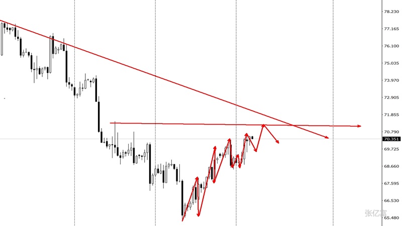 原油今日再次出现了探底回升走势,在触及69.5美元之后,油价出现了多头延续,最高点触及70.9美元一带徘徊。原油从日线图级别看,中期走势仍跌破区间下沿支撑,呈下行节奏。均线系统空头排列,中期客观趋势向下。下跌趋势线依旧形成打压,当下回暖反弹的力度有限,重点关注71.4一带是否站稳。原油四小时级别上看,油价触底反弹,油价反复穿越均线系统,短线客观趋势震荡整理运行。油价在69.5一带再次得到支撑上涨,后市该水平将视为重要多头平台支撑。综合以上分析,张亿富认为:原油再次探底回升,多头有望延续,今日操作上考虑回撤布局多单为先,高空为辅,上方关注71.5-72.5美元阻力,下方关注69.5-69.0美元支撑。今日原油实盘在70.2-69.8多一次,获利在在70.9一带。