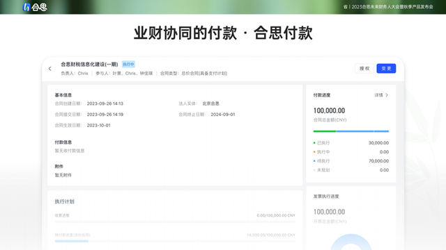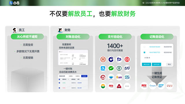 比如企业付款所涉及的收票、预付款和付款结算等环节,合思的财务SaaS平台能让企业付款变得更敏捷,从繁琐的流程工作中解放财务人。