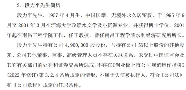 简历显示,段力平1957年4月出生,1995年9月至2001年3月于河海大学获得博士学位,2001年起在南昌工程学院工作,任正教授,曾任南昌工程学院水利经济研究所所长。目前段力平持有光一科技490万股。